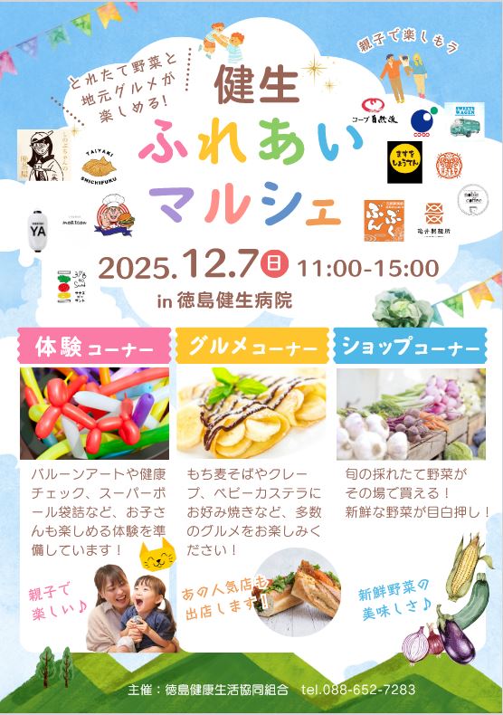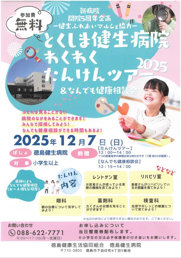 徳島健生病院 わくわく体験ツアー・なんでも健康相談 開催案内 2025年11月7日 最終更新日時 : 2025年11月7日 スタッフ12026年12月7日(日) 開催健生ふれあいマルシェ開催コラボし徳島健生病院では、わくわく体験ツアー・なんでも健康相談会を開催いたします。(@^^)/~~~ お気軽お越しください。