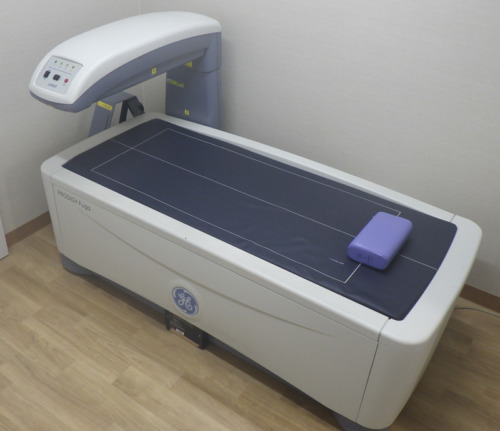 当院では「DEXA法」というX線を利用した全身用骨密度測定装置を導入しており、腰の骨(腰椎)と太ももの付け根(大腿骨頸部)の二カ所を測定します。さらに、骨の量(骨量・骨密度)だけでなく、骨の質(骨質)も調べることができる最新のシステムを導入しています。検査時間は約5分ほどで終了します。