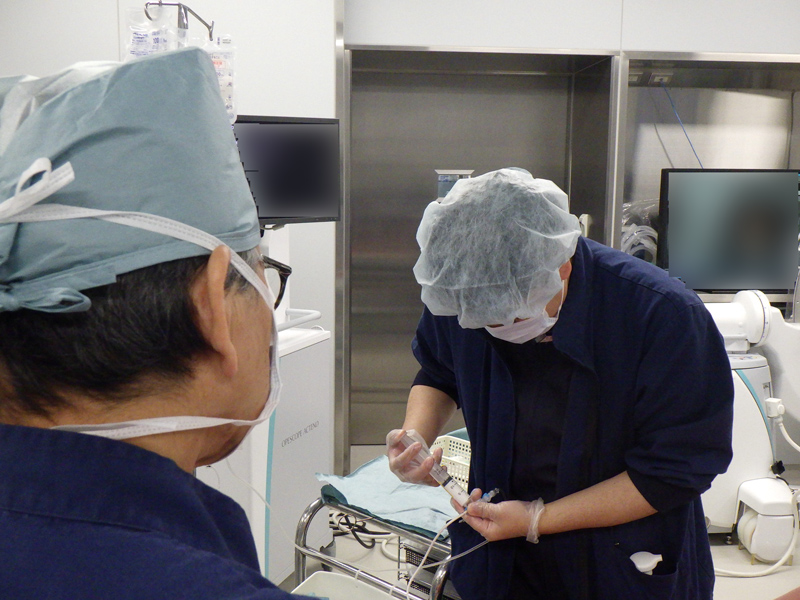 この他に手術中は麻酔医や他の間接介助の看護師と連携して患者さんの異常を早期に発見できる様にしています。又、手術後の患者さんの所に訪問してお話を伺い、スタッフ間で術中の看護の振り返りをして患者さんが安全・安楽・安心に手術が受けられるように日々業務を行なっています。