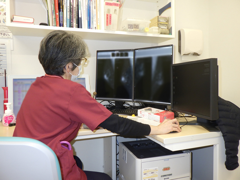 検査時間は約10分程度で、乳房を板で挟んで圧迫し、薄く伸ばした状態で撮影を行います。このように圧迫して撮影を行う理由は、乳腺の重なりを少なくして病変を見やすくするため、そして撮影に必要な放射線量を低減するためです。人によっては痛みを伴うことがありますが、我慢できないほど強い痛みを感じる場合は、遠慮なく技師にお声かけください。スタッフ一同、皆さまがリラックスして検査を受けられるよう丁寧な対応を心がけております。